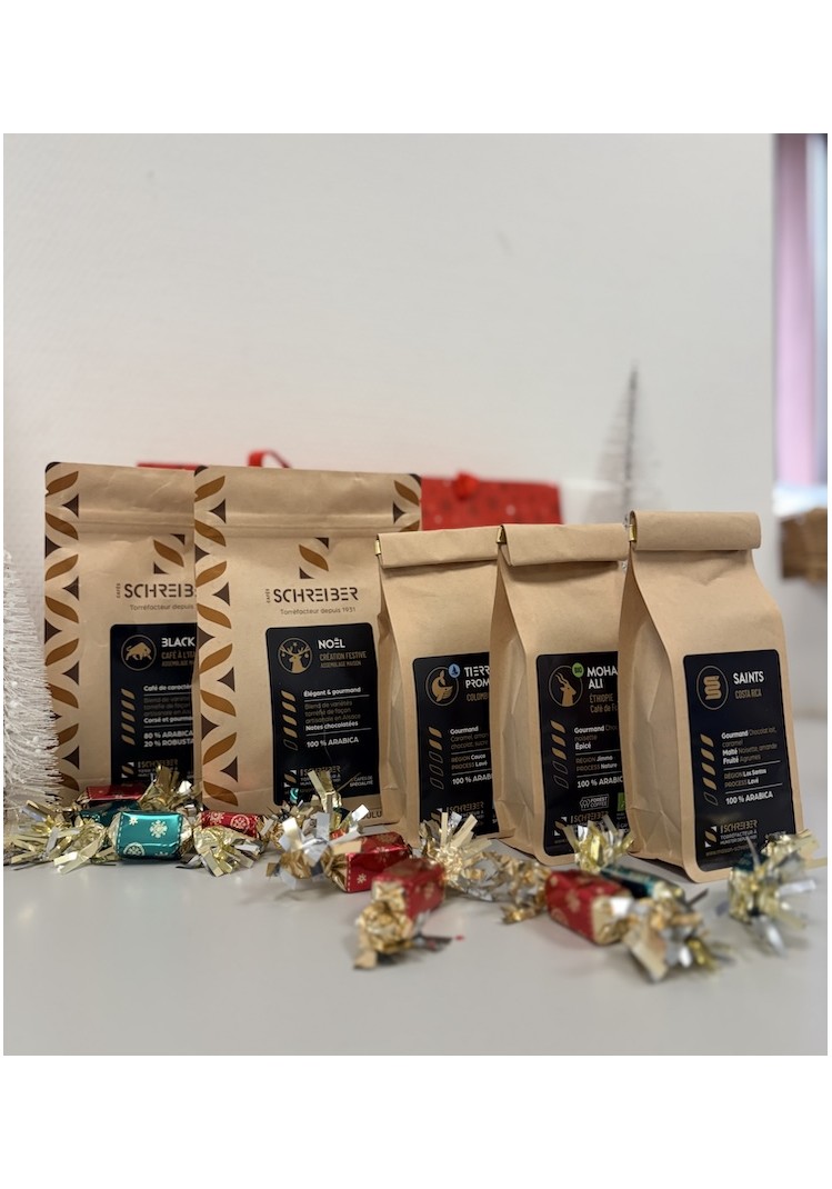 ATTENTION : en fonction des arrivages de café, il se peut qu’un des cafés listés ci-dessus soit en rupture de stock. Cependant, nous le remplacerons par un café similaire afin de garantir un assortiment toujours aussi complet !